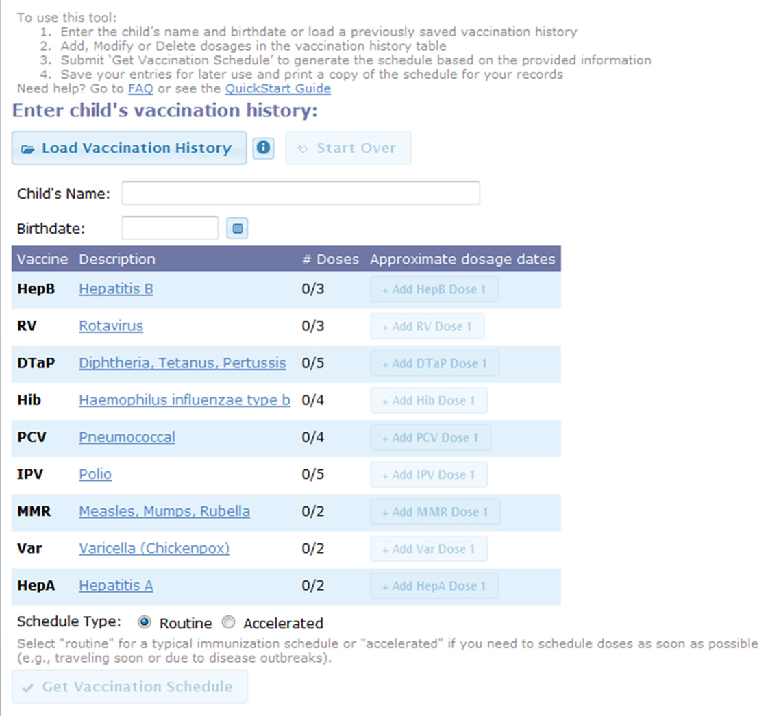 The online tool removes the challenging task of simultaneously considering complex rules, guidelines and discretionary considerations when creating a catch-up schedule. A physician or caregiver simply inputs a child’s date of birth and previous immunization dates, and selects whether to administer the vaccines as soon as possible or to administer the vaccines when recommended. Then the program displays a personalized schedule of the recommended dates to administer all future vaccines, which can be saved to the user’s computer.